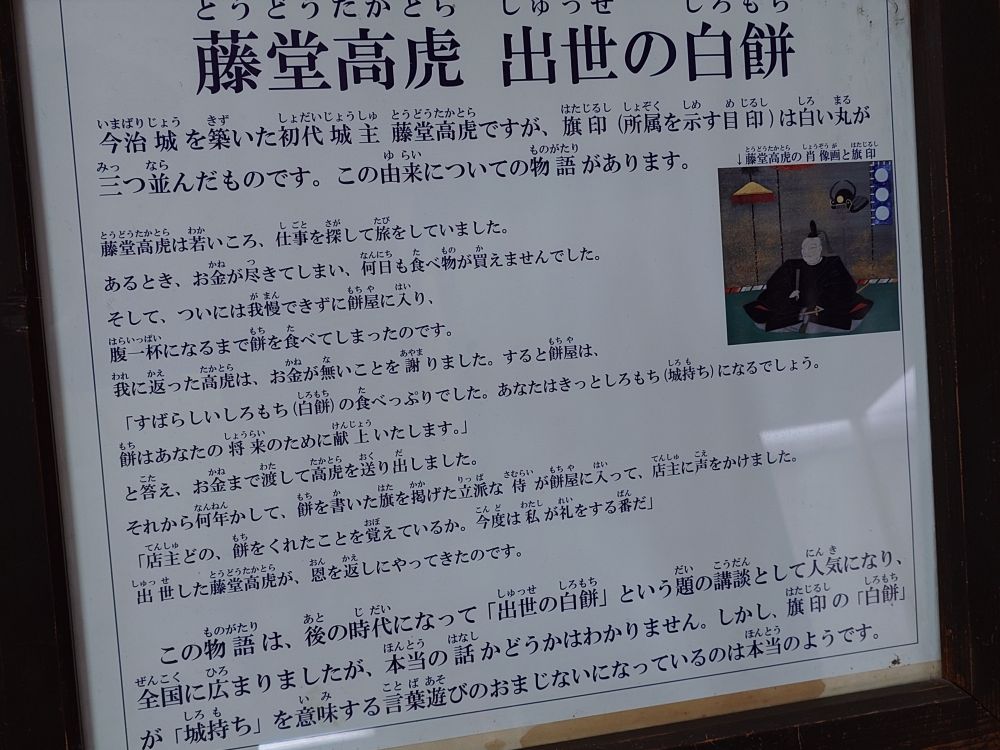 若いころの藤堂高虎が、吉田宿(豊橋)の餅屋に入って餅を盗み食いしたところ、餅屋からは良い白餅の食べっぷりであった、きっと良い城持ちになる……と盗み食いを許したうえお金まで持たせて送り出した、という内容。